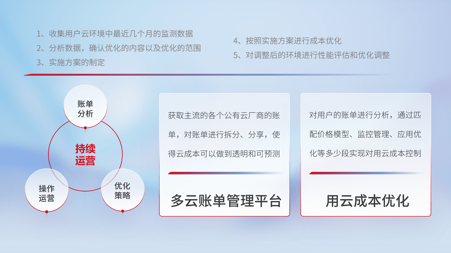 通过多云纳管,,以统一的资源数据模型把客户的云资源进行抽象和封装,,,,进而实现对多云资源的统一操作,,保障云资源管理的可靠性、、、稳定性与可用性。。。。量身定制化运维内容,,,,配置、、、、开发运维、、补丁管理、、、备份、、、、监控、、、、认证和访问管理、、、审计和日常巡检等,,,,保障在用云过程中的可靠度,,,,稳定度以及高可用率。。。。